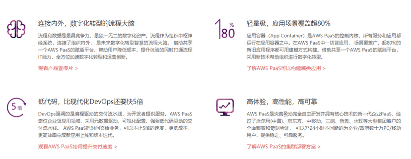 流程是组织的中枢神经系统,是数字化运营创新引擎。 AWS PaaS的设计初衷是通过流程将组织内外的业务、人员和IT系统紧密连接在一起, 共享一个能力运营平台。AWS PaaS以低代码和流程为能力、以快速构建应用为核心的“六脉神剑”赋能客户和伙伴,以更低的成本、更高的效率打通平台化构建应用的经脉。 AWS PaaS为开发者和非开发者构建下一代企业应用提供了完整、专业、低代码的基础设施工具, 包括BPM(Business Process Management,业务流程管理) 的全部能力、 应用建模、移动管理、开放API和复杂后端集成服务。通过我们与伙伴汇聚的行业经验,提供可直接实施的优质打包应用,在降低需求风险和开发成本的情况下,获得更高满意度。