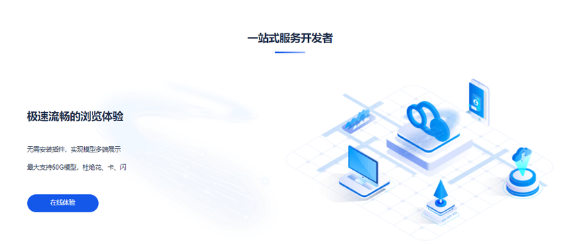 极速流畅的浏览体验:无需安装插件,实现模型多端展示,最大支持50G模型,杜绝花、卡、闪。 丰富易用的开发工具:无需掌握图形技术,实现模型轻量化和3D交互展示,提供丰富的SDK和API,简洁易用。 交互功能:模型交互、动画交互、材质替换、热点标注、多媒体植入、特效效果。