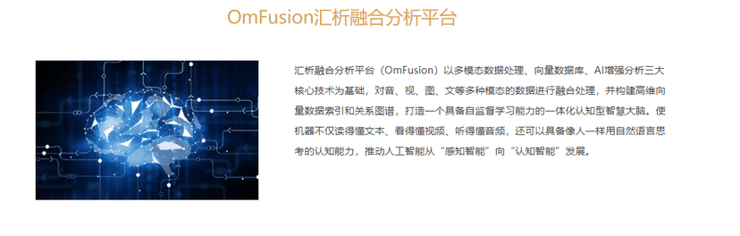 汇析融合分析平台(OmFusion)以多模态数据处理、向量数据库、AI增强分析三大核心技术为基础,对音、视、图、文等多种模态的数据进行融合处理,并构建高维向量数据索引和关系图谱,打造一个具备自监督学习能力的一体化认知型智慧大脑。使机器不仅读得懂文本、看得懂视频、听得懂音频,还可以具备像人一样用自然语言思考的认知能力,推动人工智能从“感知智能”向“认知智能”发展。