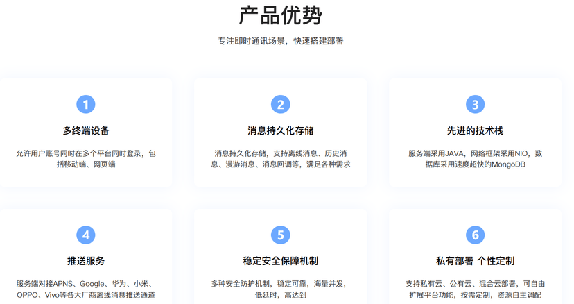 我们是一家以技术驱动互联网创新、产品升级、互联网商业服务发展的公司。公司专注于公众号、小程序、APP与WEB系统的定制开发,提供基于互联网+的行业细分解决方案,拥有专业的项目开发实力和经验。其中深耕音视频直播系统开发、NTF数字藏品平台系统开发,智慧商业系统,依托多年的互联网核心技术沉淀,为创业者与企业提供符合企业“互联网+”战略的软件产品设计、开发以及解决方案,以技术创新驱动企业可持续发展。我们为每位客户提供源代码交付、模块化交付、云部署和本地化部署、满足企业个性化十足的应用的需求。 产品优势: 多终端设备 允许用户账号同时在多个平台同时登录,包括移动端、网页端 消息持久化存储 消息持久化存储,支持离线消息、历史消息、漫游消息、消息回调等,满足各种需求 先进的技术栈 服务端采用JAVA,网络框架采用NIO,数据库采用速度超快的MongoDB 源码出售 出售完整的成品系统源码,丰富的产品线选择,原生开发,快速搭建部署 部署搭建 全球节点服务器搭建,支持任意流媒体,分布式部署,提供高并发解决方案