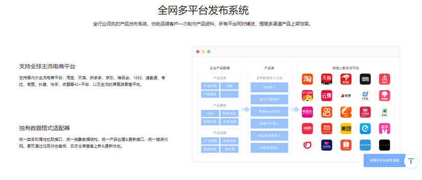全网多平台发布系统(Multi-Platform Network),全行业领先的产品发布系统,协助品牌客户一次制作产品资料、所有平台同时铺货,大大提升品牌商上货、更新产品资料效率。目前对接国内常见20多家电商平台,以及主流的屏幕端零售平台。 支持全球主流电商平台 支持国内外主流电商平台:淘宝、天猫、拼多多、京东、唯品会、1688、速卖通、考拉、有赞、抖音、快手、微盟等40+平台,以及主流的屏幕端零售平台。 独有数据格式适配器 统一类目和属性拉取接口,统一抽象数据结构,统一产品创建&更新接口,统一错误代码。更可通过任务状态看版、日志仓库查看上新&更新状态。